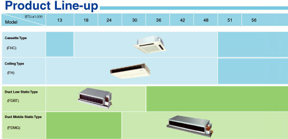 เครื่องปรับอากาศแบบ SkyAir ของไดกิ้นได้รับการออกแบบให้เหมาะกับทุกพื้นที่การใช้งาน ทั้งในที่พักอาศัย ที่ทำงาน และร้านค้าหรืออาคารพาณิชย์ทั่วไป ด้วยการออกแบบที่สวยงาม เสียงการทำงานที่เบา ความสะดวกสบายในการใช้งาน และง่ายต่อการบำรุงรักษา มีให้เลือก 4 แบบ ทั้งแบบ Cassette Type ฝังในฝ้า, แบบ Ceiling Type แขวนใต้ฝ้า, แบบ Duct Type ฝังในฝ้าหรือต่อท่อลม 2 แบบขนาดแรงลมต่ำ และปานกลาง |